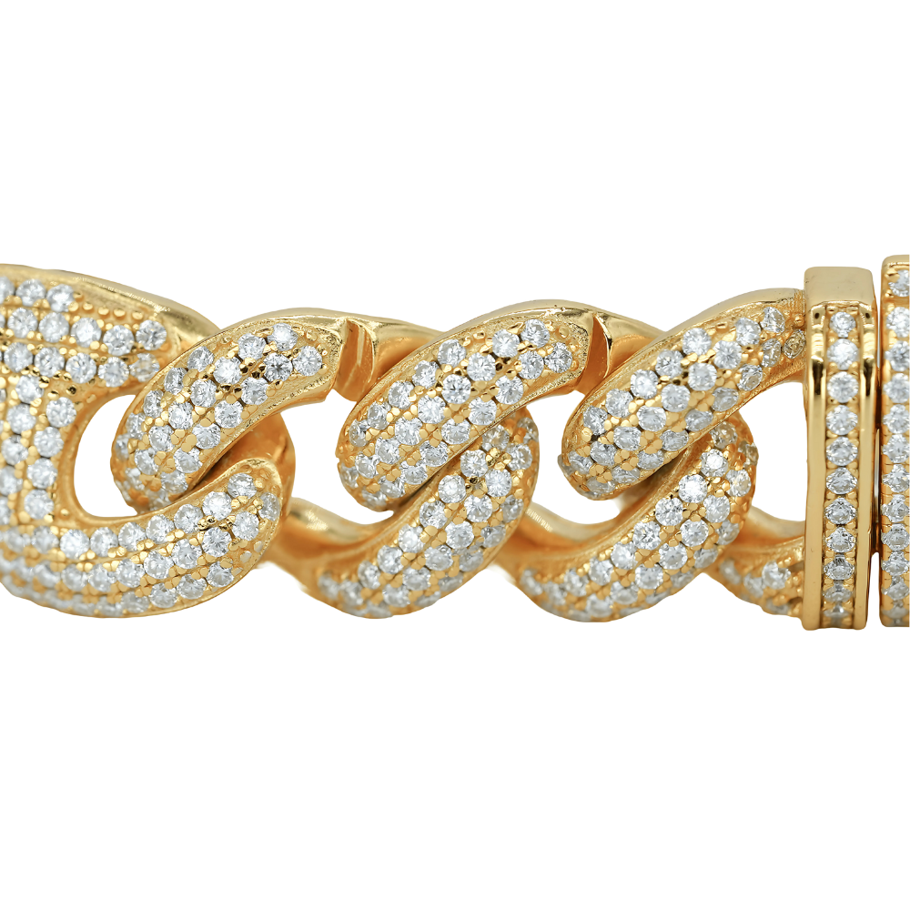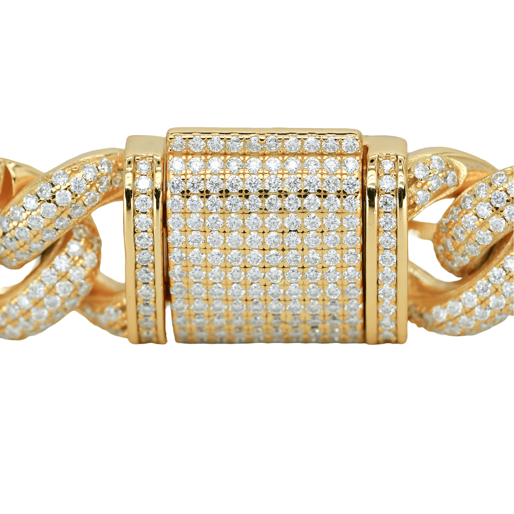Crafted from premium yellow gold and encrusted with VVS Moissanite diamonds, this piece delivers unmatched brilliance, fire, and clarity. The 15mm width offers a bold presence, while the secure clasp ensures a comfortable and confident fit.